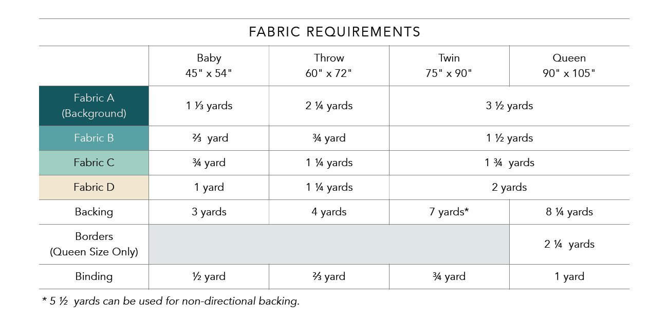 See photos for fabric requirements. The quilt sizes included in this pattern: